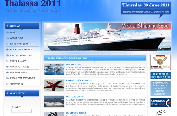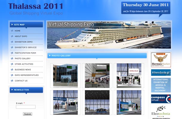 H Τhalassaexpo είναι μια από τις μεγαλύτερες εικονικές εκθέσεις ναυτιλίας με την υπογραφή της compass που δημιουργεί εκθέσεις εδώ και πολλά χρόνια. Η σελίδα αυτή είναι στα αγγλικά. Αποτελείτε από τους εκθέτες που μπορούν να μπουν με ένα εικονικό περίπτερο, και τους ενδιαφερόμενους που έχουν στην διάθεση τους μέσω ενός site τα προϊόντα από τις μεγαλύτερες εταιρείες στον χώρο της ναυτιλίας.
